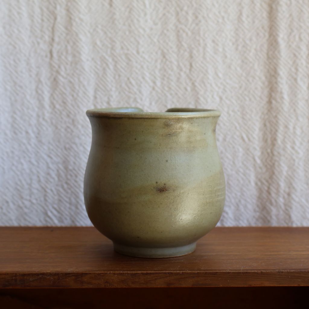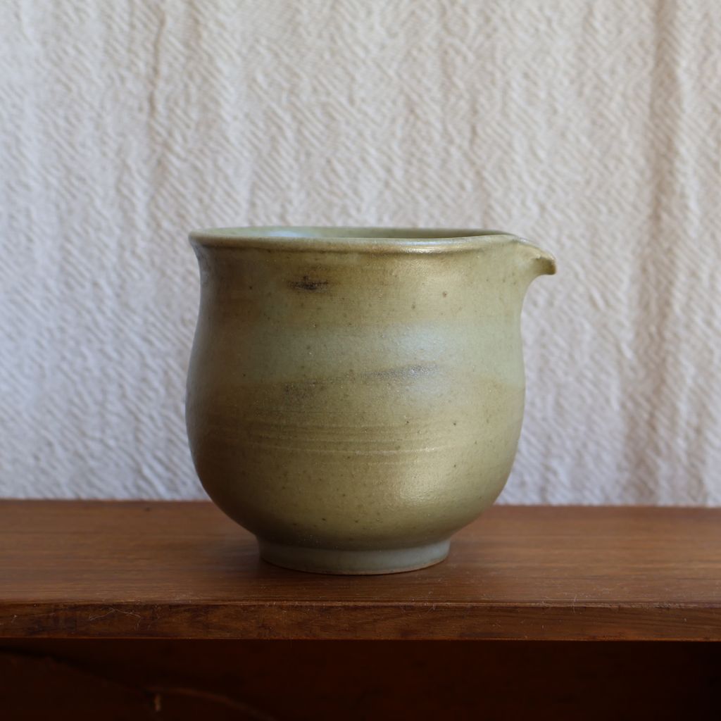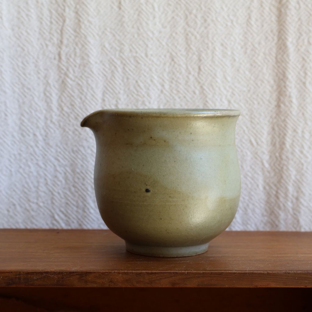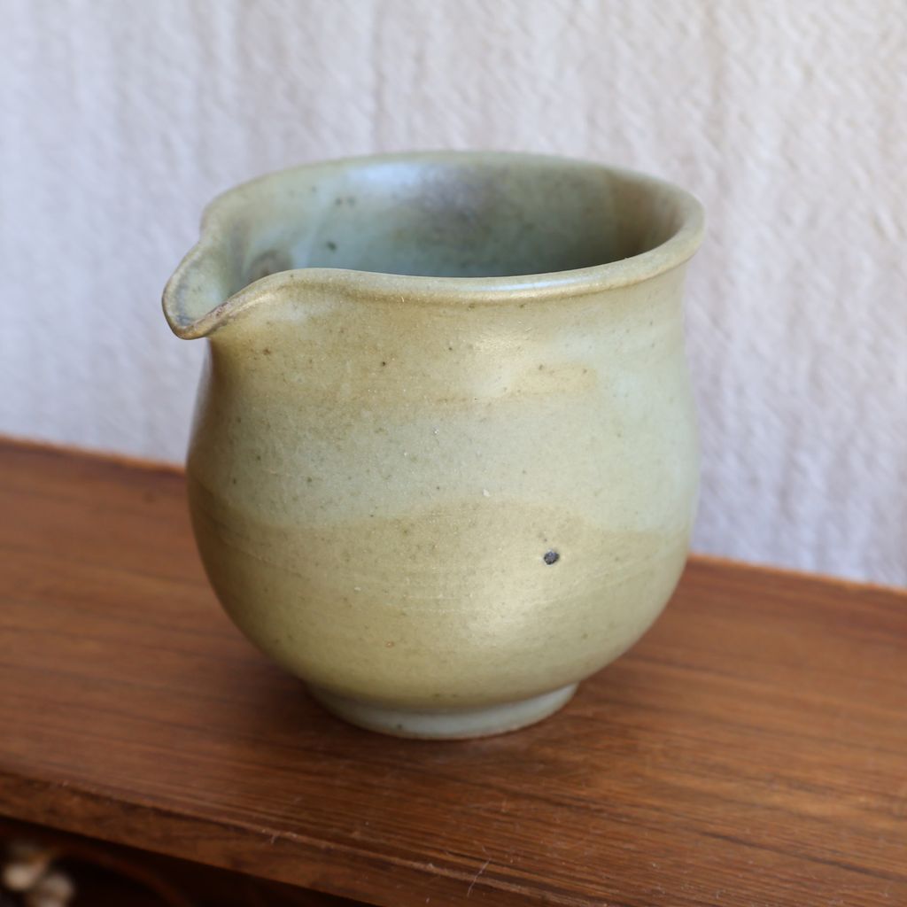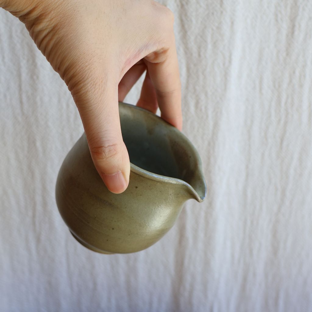手感渾圓飽滿,表面覆上一層淡綠色的釉色,加上柴燒自然落灰,如同晨曦照耀下的青苔石,柔和而寧靜。