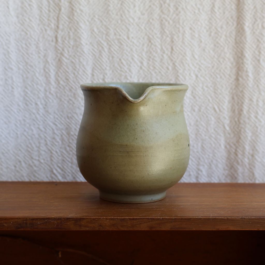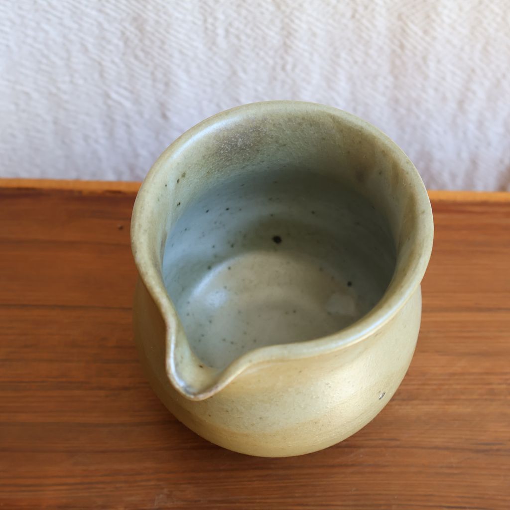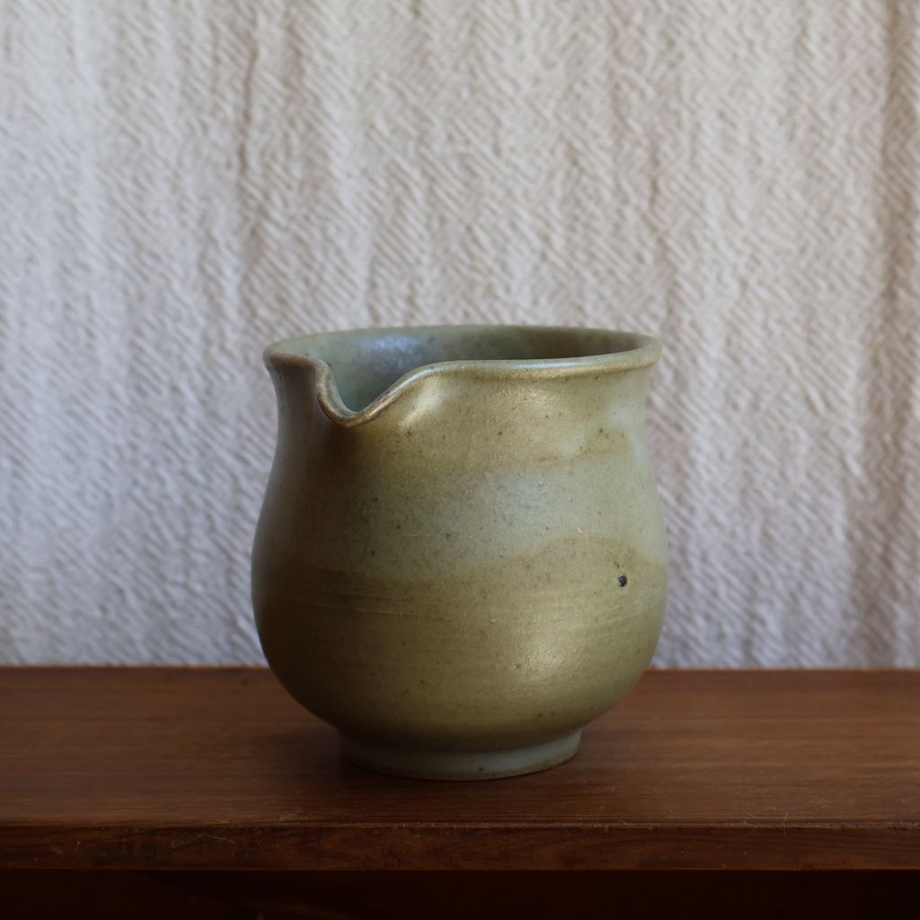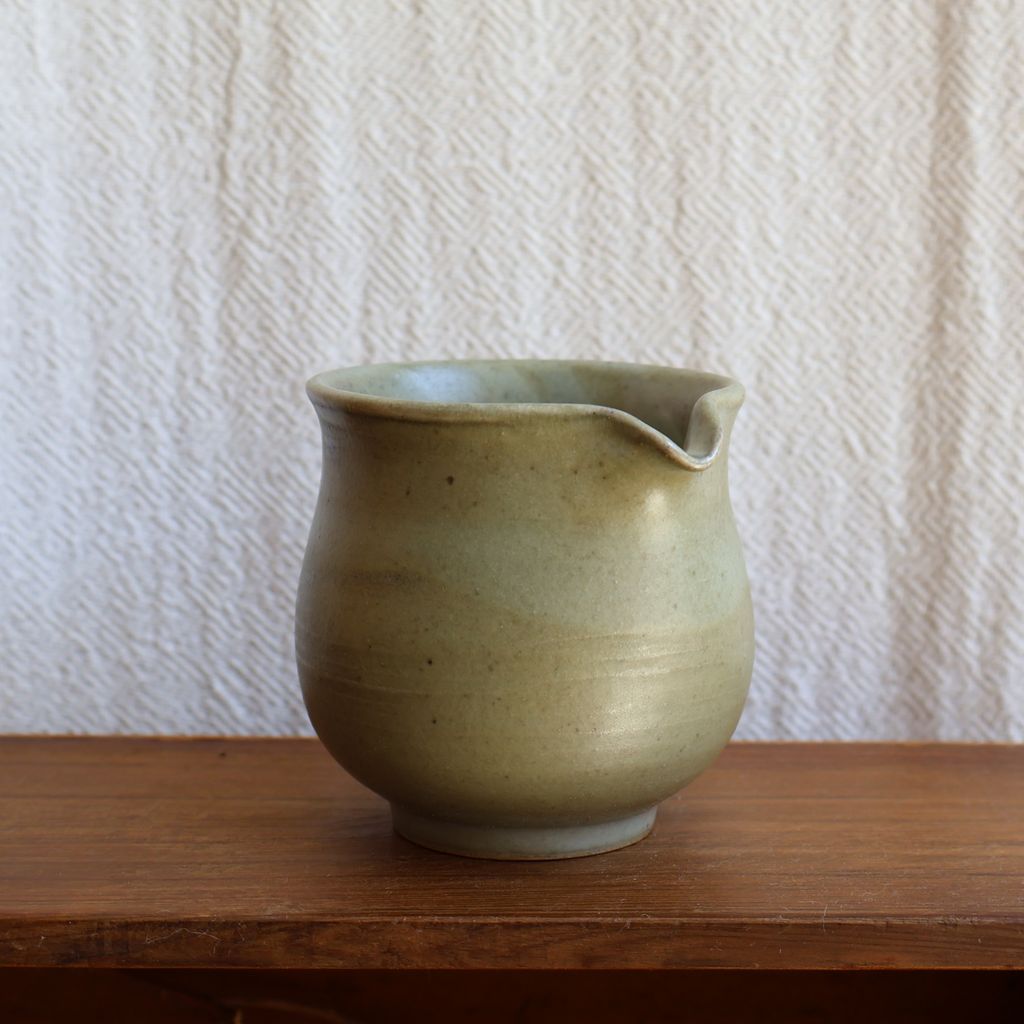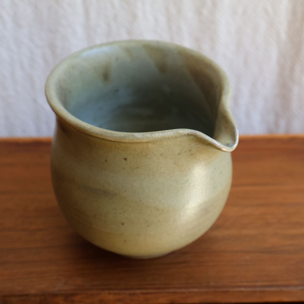 手感渾圓飽滿,表面覆上一層淡綠色的釉色,加上柴燒自然落灰,如同晨曦照耀下的青苔石,柔和而寧靜。